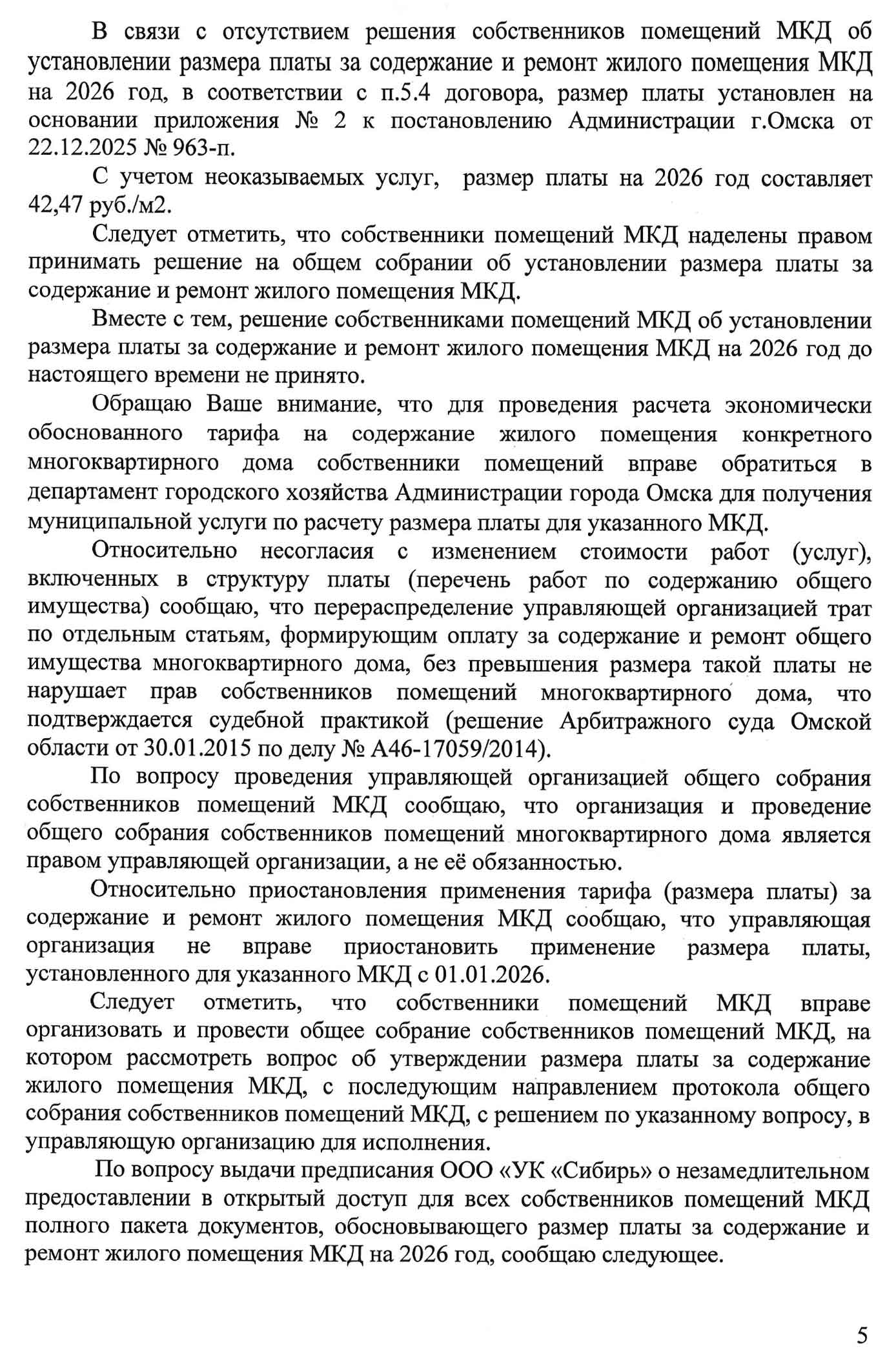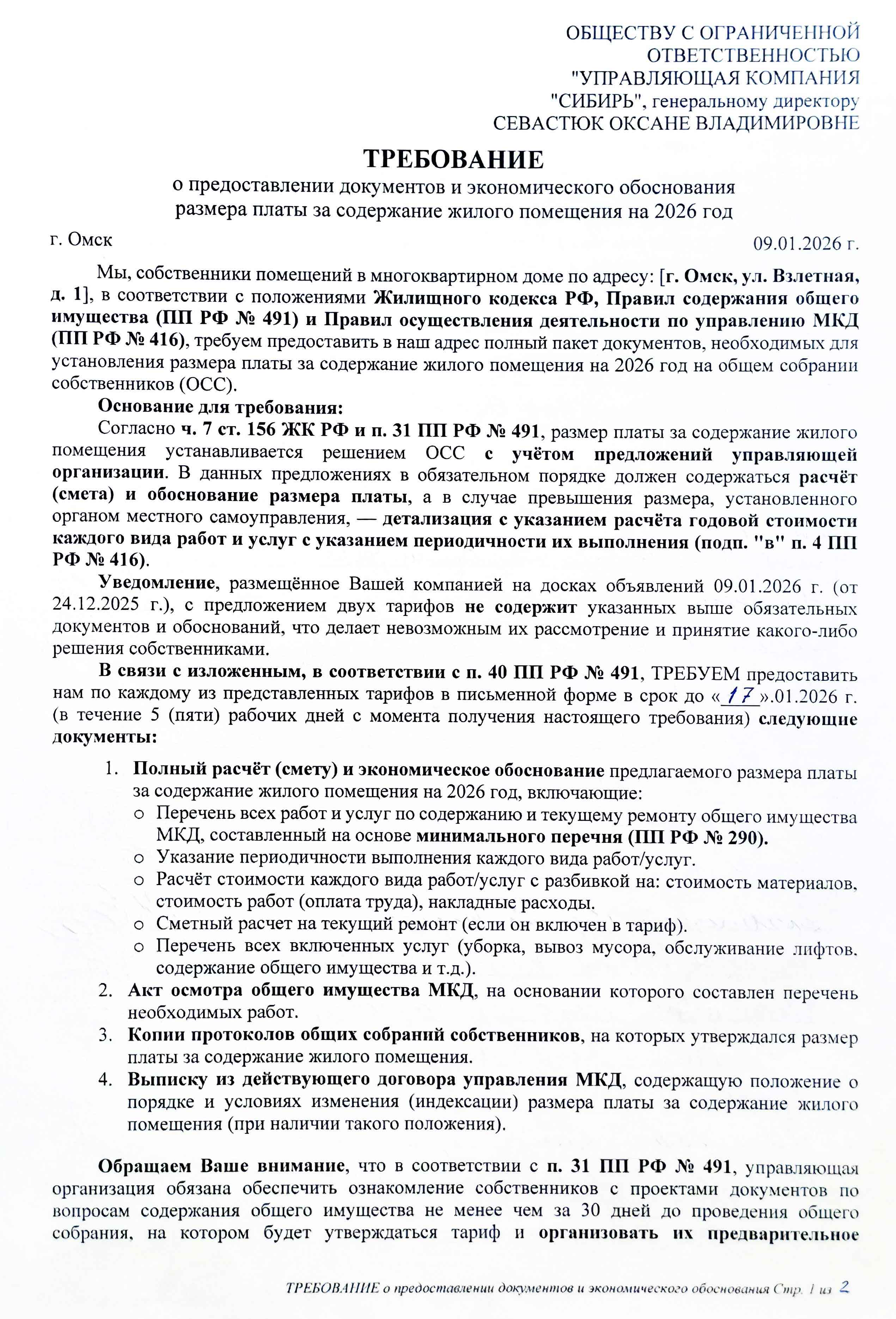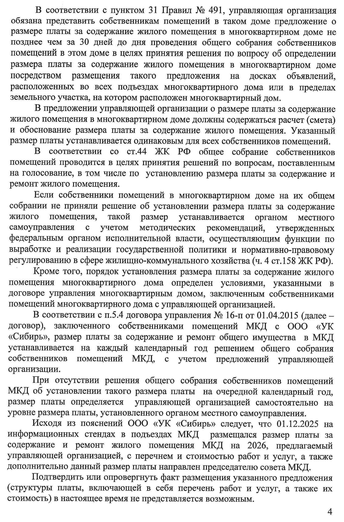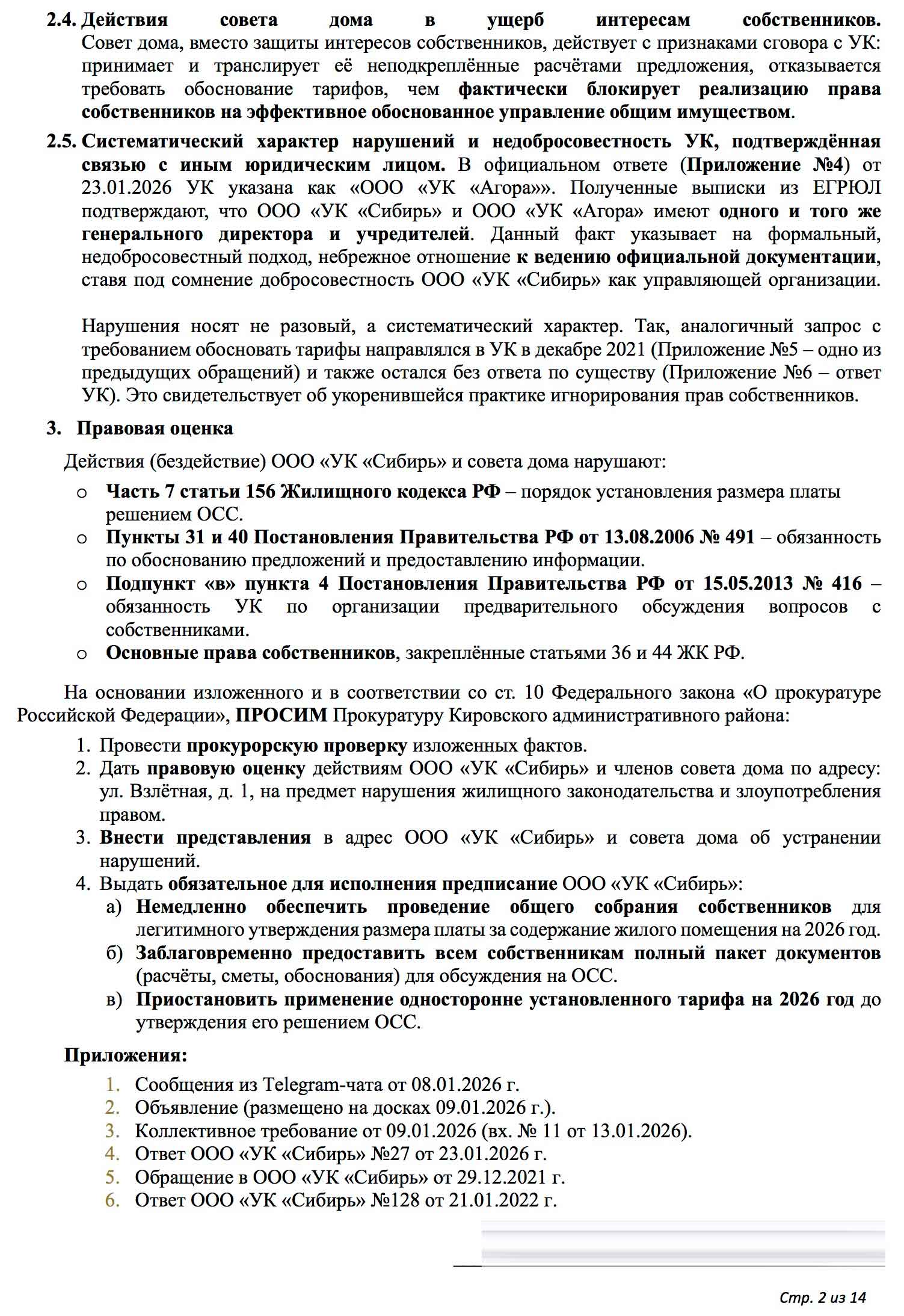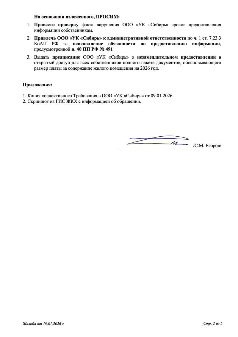 Парадокс: Собственники знают о своих правах и знают, что могут переизбрать совет или сменить УК. Но они хотят, чтобы контролирующий орган (ГЖИ) выполнял свою функцию — контролировал и заставлял работать ООО «УК «Сибирь» в рамках закона, а не перекладывал всю ответственность на собственников. В условиях, когда в доме царит атмосфера запугивания и многие либо напуганы, либо предпочитают оставаться в стороне, провести реальное ОСС и принять решения, нужные дому, но не интересные ООО «УК «Сибирь», невозможно. Единственный путь — суд, который может затянуться на годы. Поэтому собственники и обращаются в ГЖИ. Но ответ — это не надзор, а «отписка» под видом разъяснений.