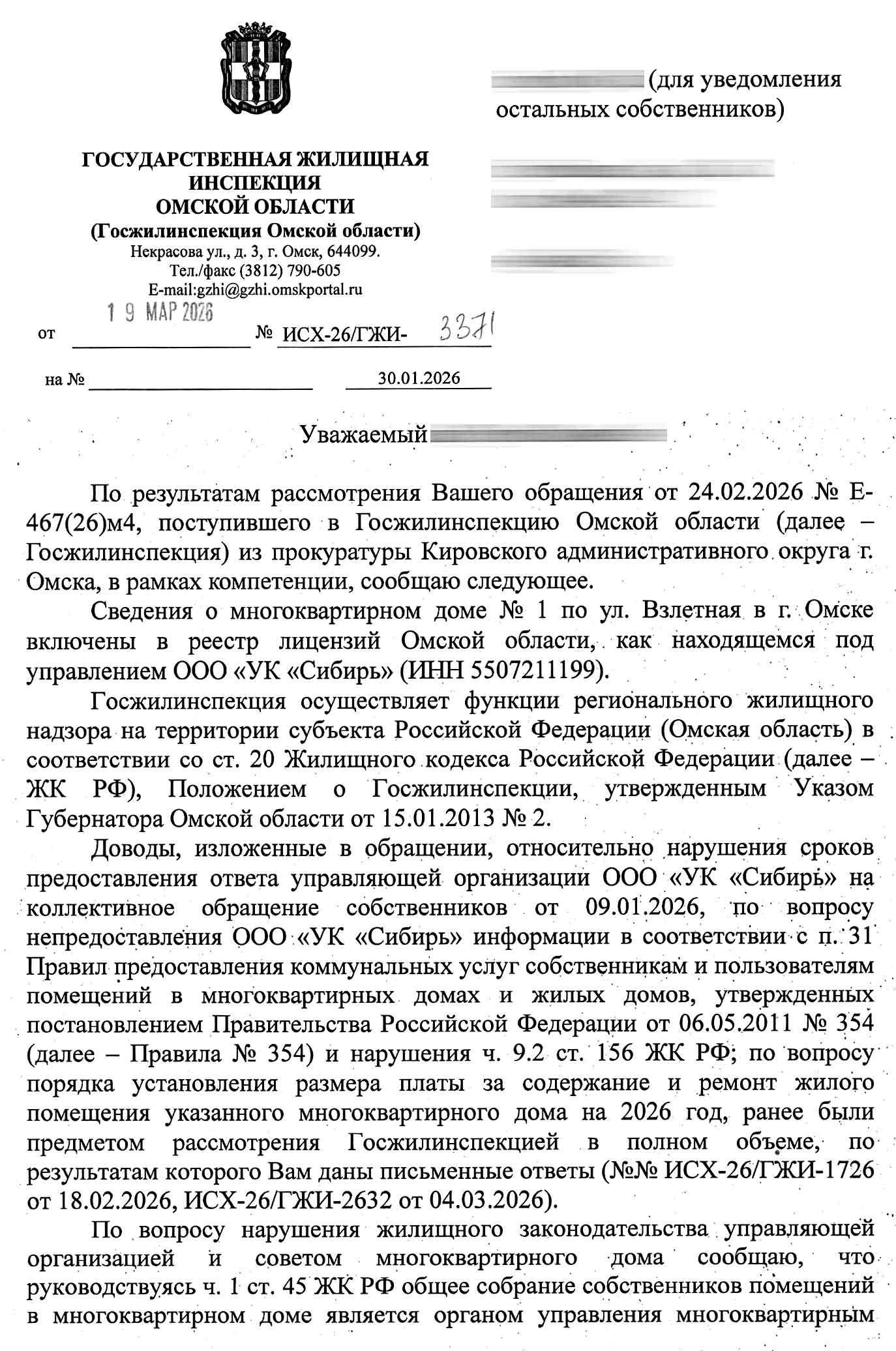 Суть ответа: ГЖИ сообщает, что доводы о нарушении сроков предоставления ответа ООО «УК «Сибирь» уже были рассмотрены ранее. В отношении нарушений со стороны УК и совета дома инспекция указывает, что: