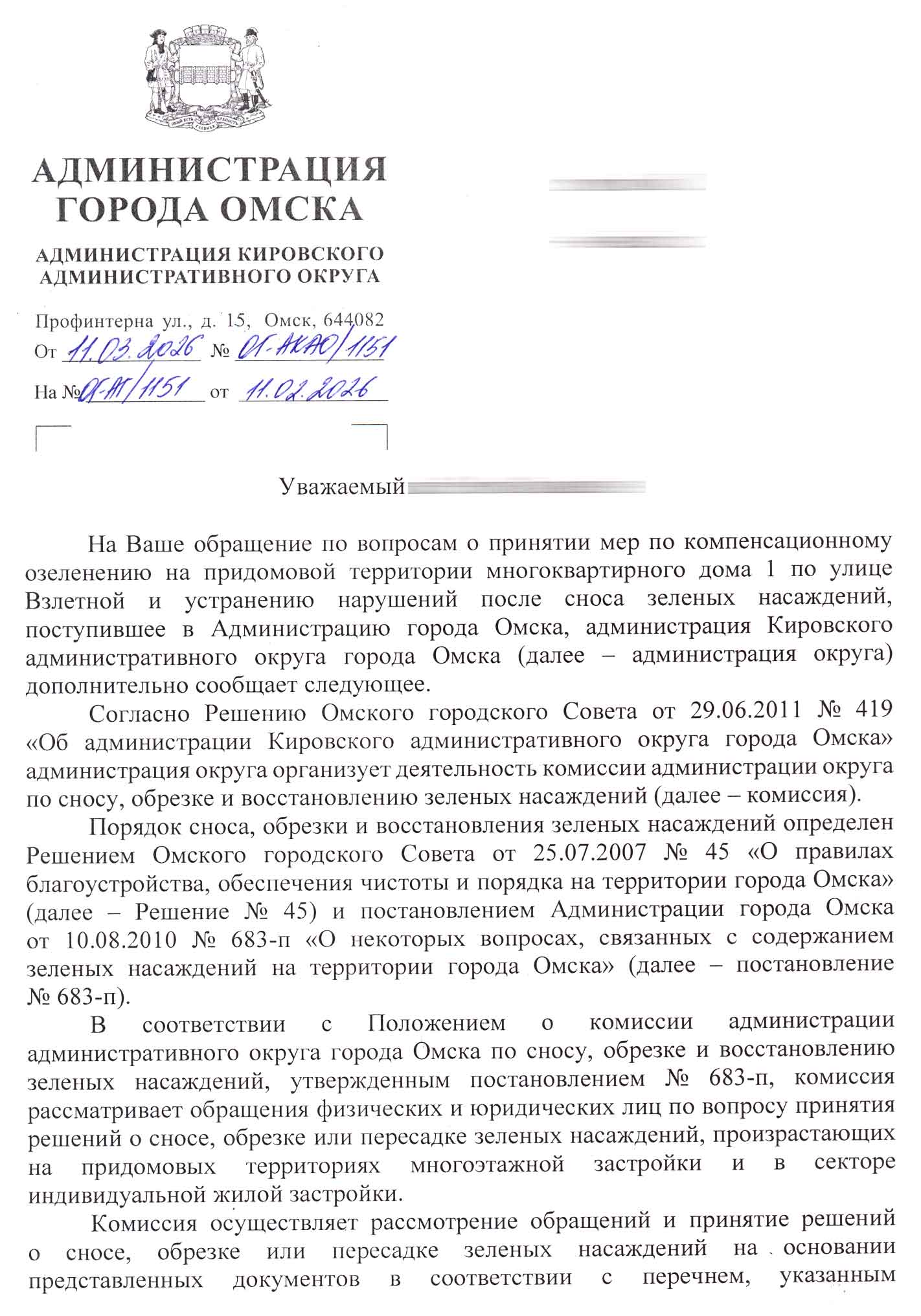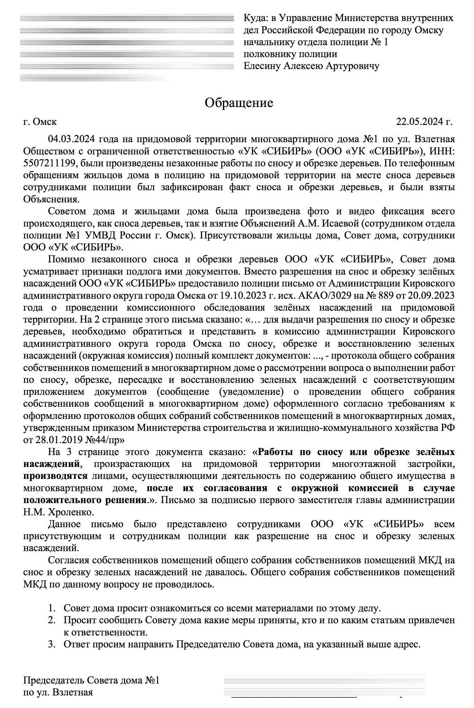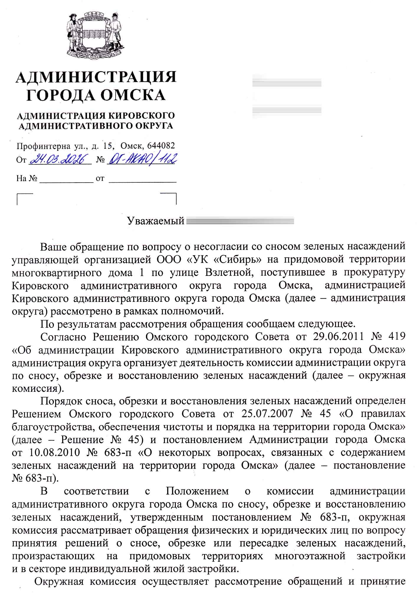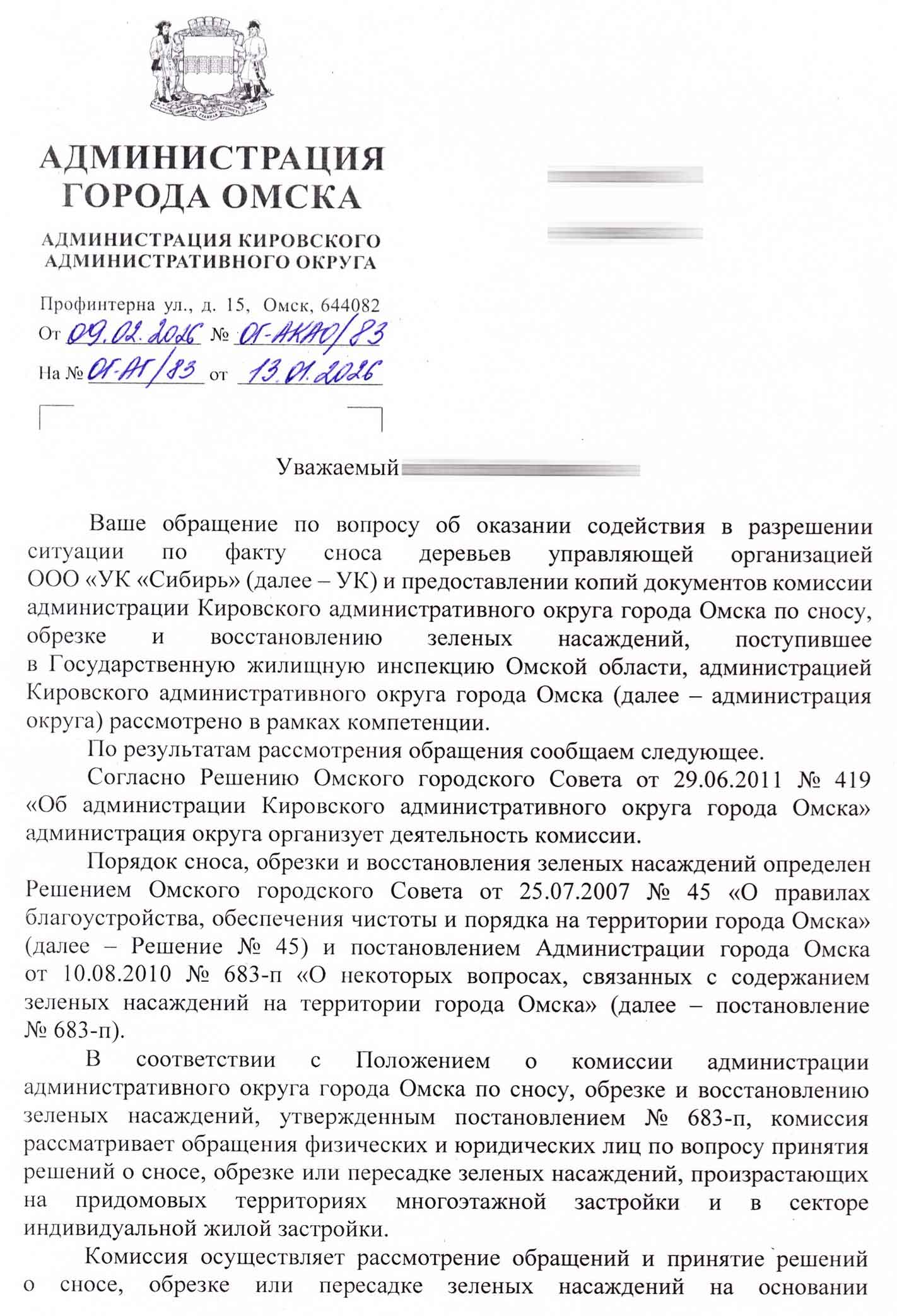 Суть ответа: Администрация подтверждает, что УК «Сибирь» в марте 2024 года произвела снос зелёных насаждений без решения окружной комиссии. При этом в ответе подробно изложена хронология:
