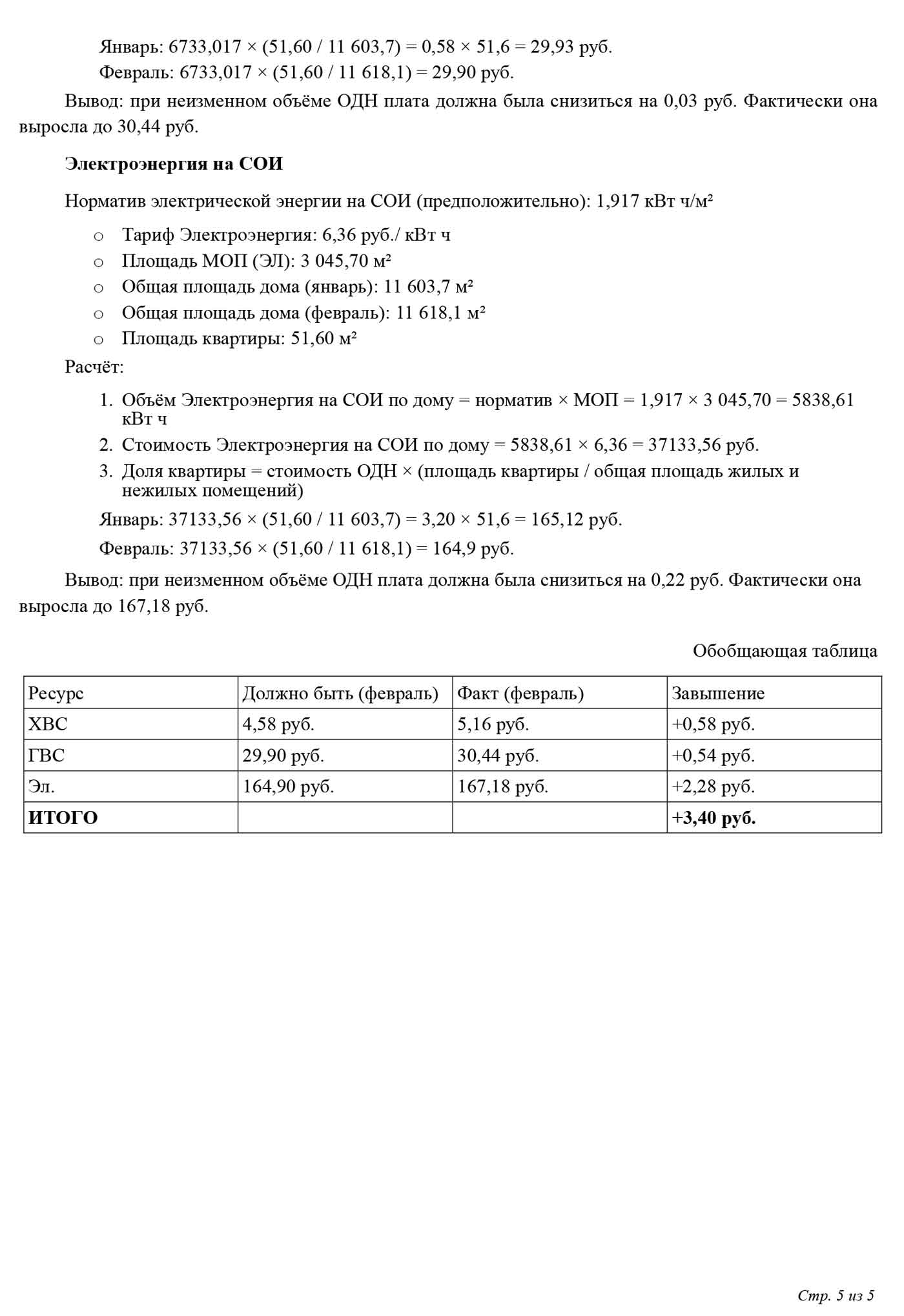 В приложении к заявлению приведён пошаговый расчёт, доказывающий: при неизменном объёме ОДН плата за ХВС, ГВС и электроэнергию в феврале должна была снизиться на 0,06, 0,03 и 0,22 рубля соответственно. Фактически же она выросла — до 5,16 руб., 30,44 руб. и 167,18 руб.